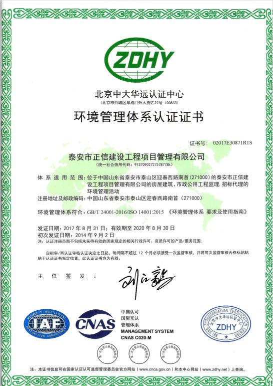 環境管理體系認證證書
